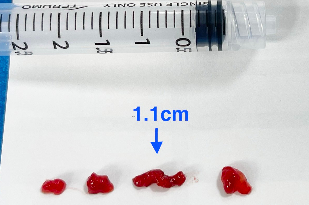 圖說:心臟黏液瘤與一般缺血性血栓相比呈現晶瑩剔透狀,四塊血栓中最大達1.1公分/聯新國際醫院提供