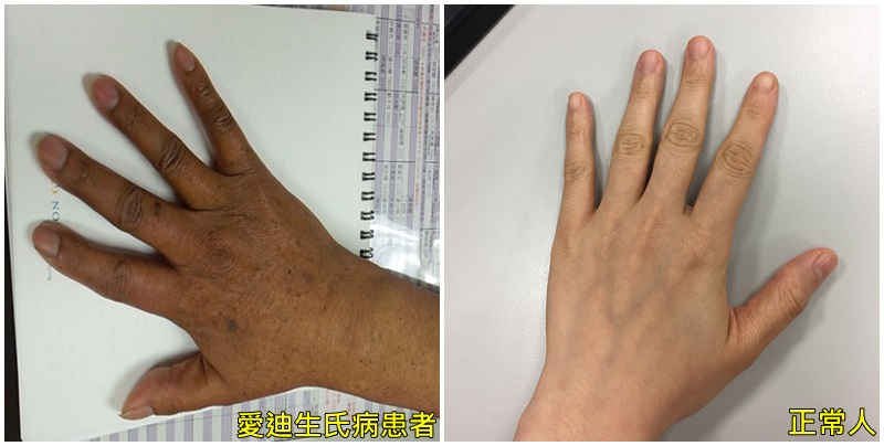徐盛邦指出,此疾病在身體表現最明顯是黑色素增加,除了受陽光照射處會變黑,甚至產生斑點外,身體一些受壓處及易摩擦處(如手肘、膝蓋、皮帶摩擦處),甚至沒有照到陽光的部位(如掌紋、嘴唇內側、牙齦),都可能出現色素沉澱,通常補充可體松和鹽皮質素即能改善。