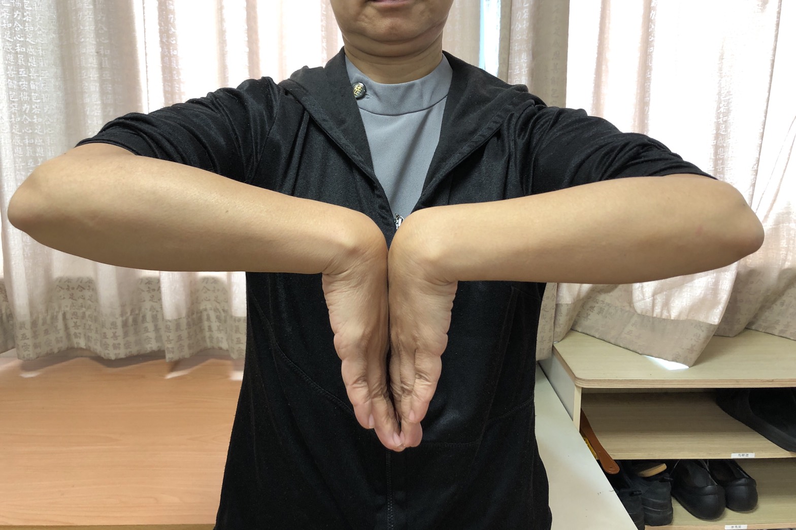 圖:兩手腕向主互相擠壓可檢查是否有腕隧道症候群