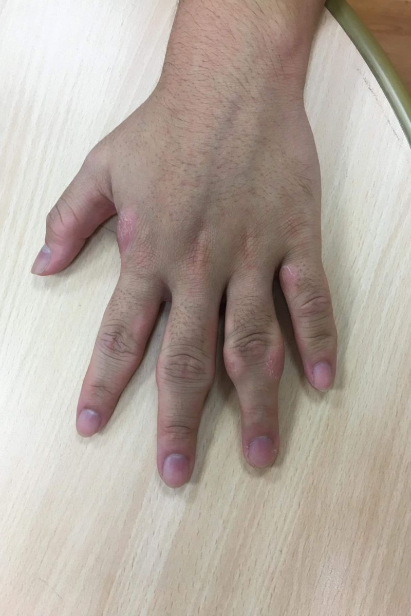 22歲的余同學從小有折手指的習慣,前陣子左手的中指及無名指關節莫名腫大,但卻不會痛,也沒有影響活動或其他不適。他曾前往骨科及皮膚科診所就醫,然而拍了X光,確定骨骼沒問題後,擦藥擦了一段時間也都未好轉,因此余同學來到台北慈濟醫院皮膚科。抽血檢查排除關節炎或免疫疾病的可能後,根據患部特徵,吳若薇醫師診斷為極少見的「指部厚皮症(Pachydermodactyly)」,予以每兩週一次的局部類固醇注射治療,至今四個月,關節已經明顯消腫,讓余同學不必再為手指外觀困擾。