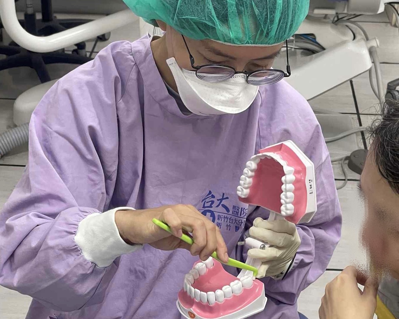 圖:莊雅淳醫師示範正確刷牙方式,提醒民眾將刷毛斜向牙齦溝,輕柔來回刷,養成良好清潔習慣,才能有效守護口腔健康/台大醫院新竹分院提供