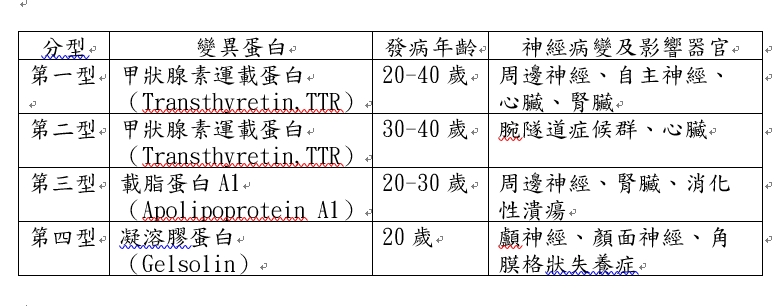 造成FAP的類澱粉變異蛋白共分為四型,以第一型及第二型的甲狀腺素運載蛋白TTR最常見。