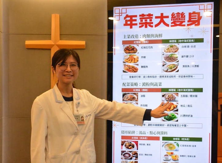 她分享年節飲食常見三大陷阱,包括不規律用餐與深夜聚餐,容易打亂身體代謝時鐘;年菜多以紅燒、油炸與勾芡料理為主,加上年糕、牛軋糖等高糖零食,熱量密度高,過剩能量容易轉化為內臟脂肪;以及香腸、臘肉與重口味醬料鈉含量偏高,搭配蔬菜與全穀類攝取不足,更容易加重血壓與代謝負擔。