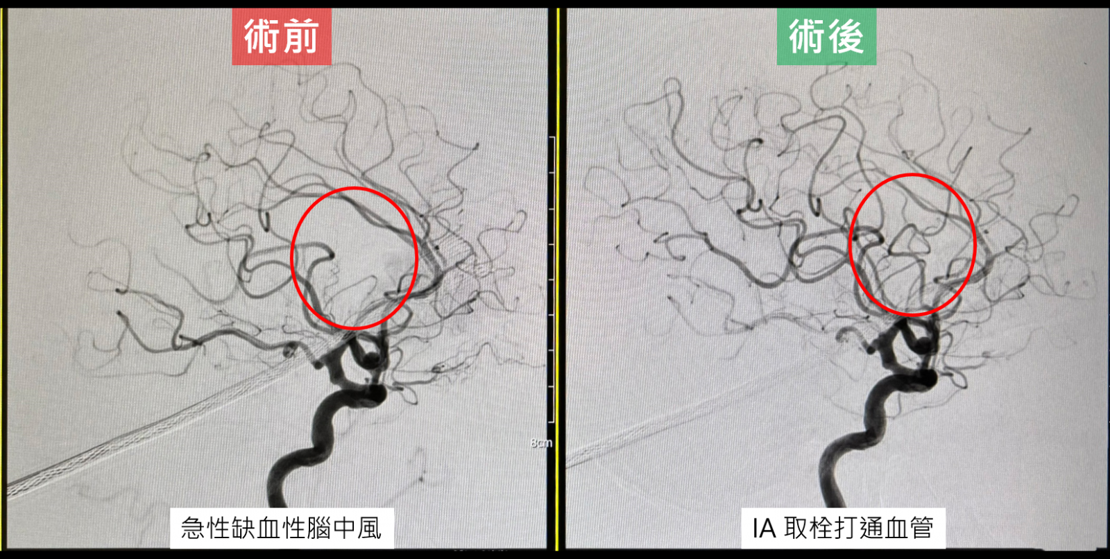 腦中風中心主任錢駿表示,個案影像顯示,患者為左側中大腦動脈M2第二分支上支阻塞,該分支阻塞在一般血管攝影中不易清楚呈現,若僅依賴常規影像,可能會錯失診斷與治療時機。所幸透過腦部電腦斷層灌注攝影輔助,團隊即時確認仍有可搶救腦組織,迅速啟動取栓手術,一次即完整移除血栓,成功挽回腦功能。