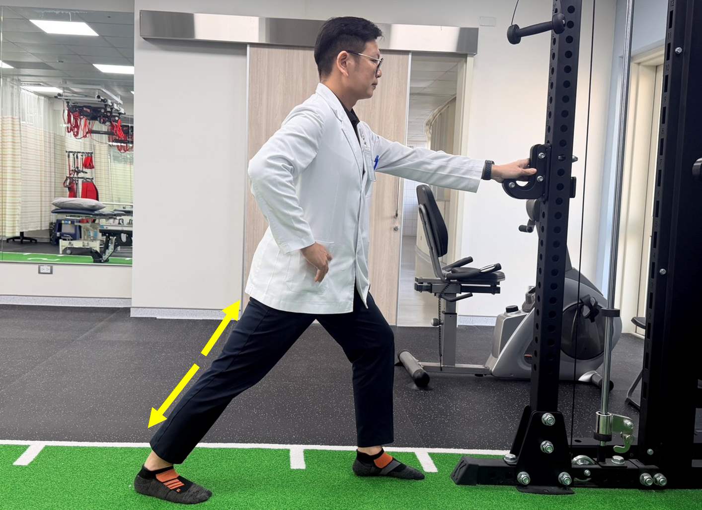 雙手扶牆,一腳在前、一腳在後,後腳腳跟踩穩,感覺小腿後側肌群被拉伸。每次維持20至30秒,三次為一組,進行三組,有助於改善小腿緊繃狀態。