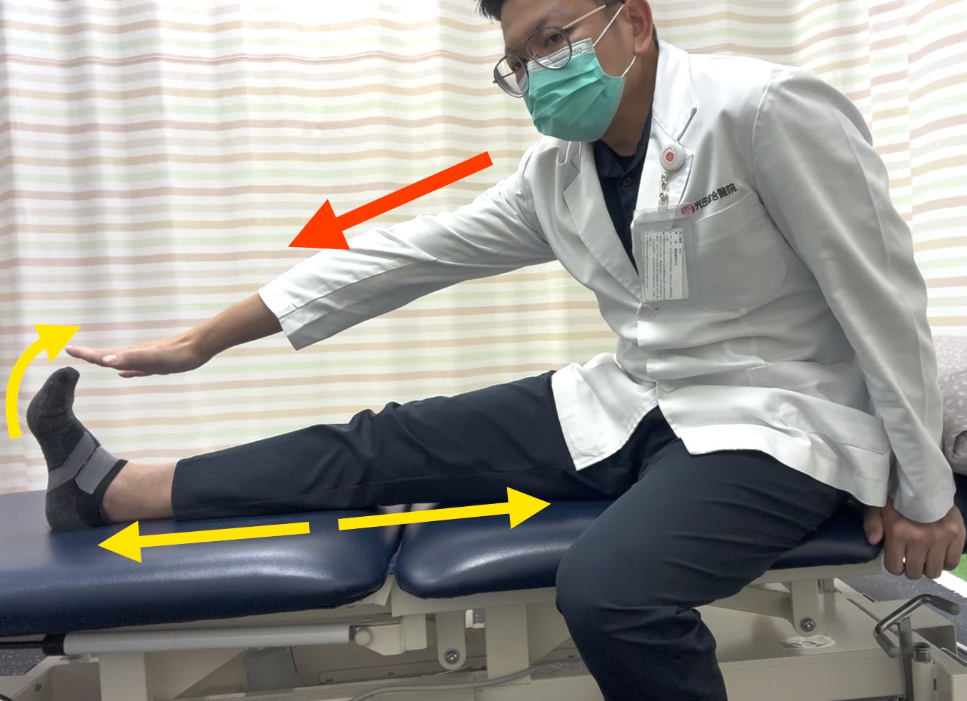 圖:抬腳休息伸展:行程間隙找時間坐下,將腳稍微墊高,膝蓋打直,腳踝上勾,上半身微微前傾,可同時拉伸小腿與大腿後側肌群/光田醫院提供