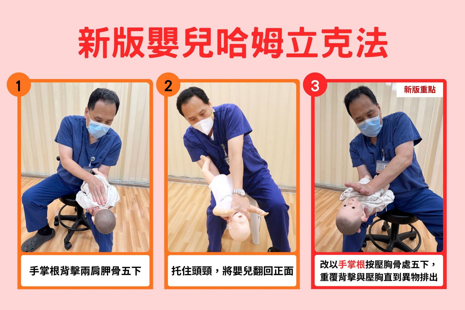 2025年指引則更新一歲以下嬰兒的胸部推壓手法,從「雙指按壓」調整為「單手掌根推胸」。莊浩凌說明,單手掌根可提供更穩定且足夠的力量,有效產生胸腔壓力,幫助排出異物。正確流程為五次拍背、五次胸部推壓交替進行,莊浩凌提醒嬰兒腹腔器官脆弱,絕對禁止使用成人腹部推壓法,以免造成嚴重內傷。