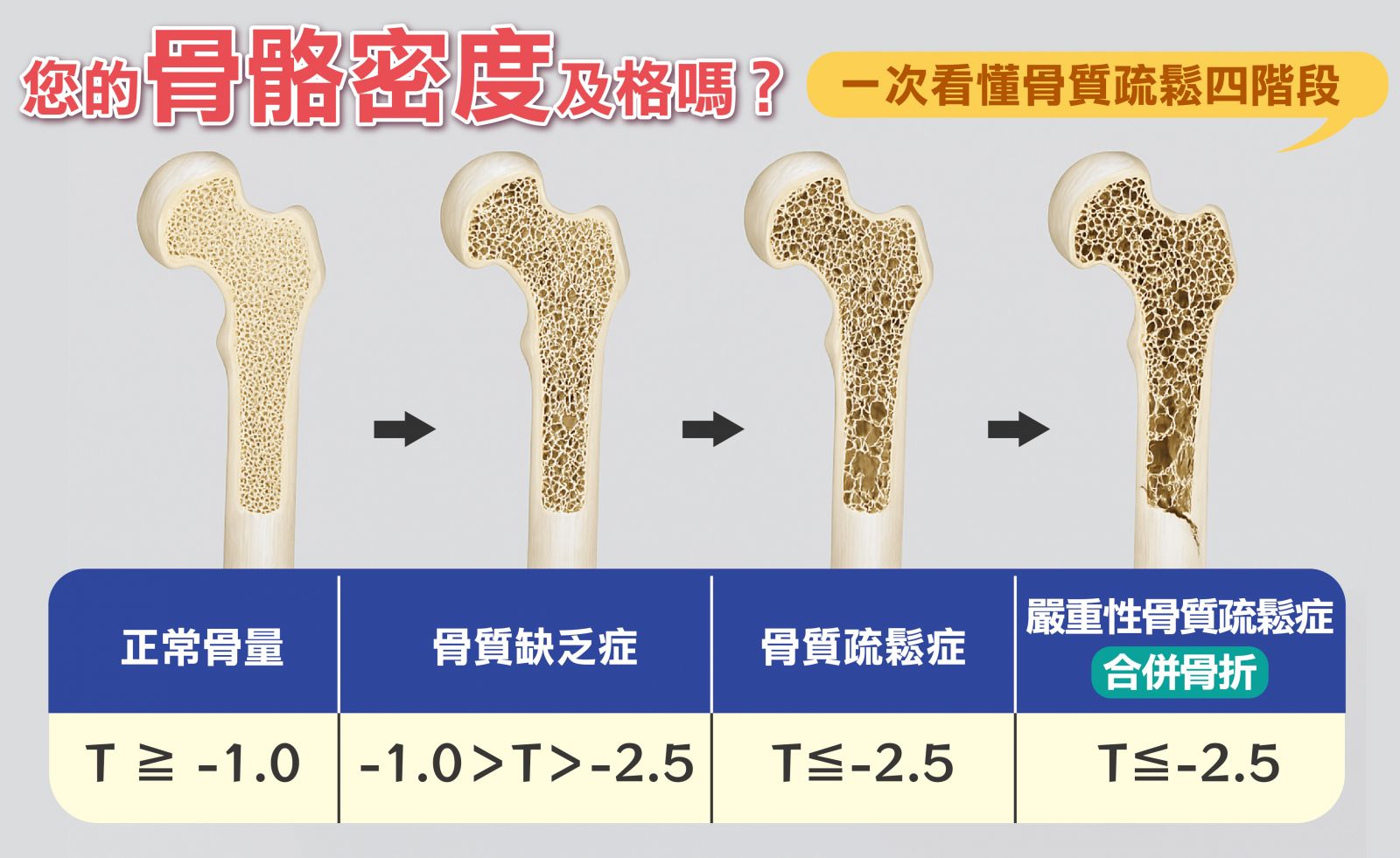 目前診斷骨質疏鬆症最準確的方式為雙能量X光吸收儀(DXA),以腰椎與兩邊髖骨的骨密度T值為標準,T值介於-1至-2.5之間的民眾已出現骨質缺失的現象,可透過日常飲食跟運動去防止骨質繼續流失,一旦骨密度T值低於 -2.5,即是罹患骨質疏鬆症。