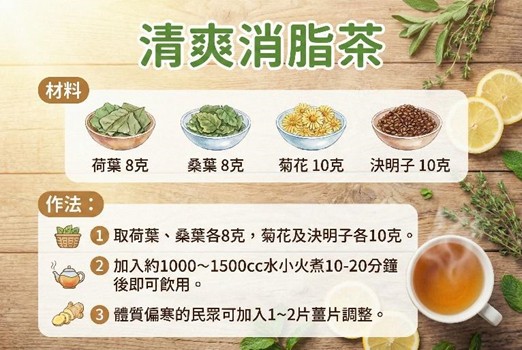 方則淳醫師推薦兩款中藥茶飲,讓大家享受美食後,去油解膩順便消脂。第一款是「消食解膩茶」,取山楂、麥芽及洛神各10克、陳皮15克、烏梅1粒、甘草3到4片,加入1000至1500毫升水,小火煮30分鐘,可熱飲,亦可放涼後飲用。若覺得太酸可適量加入蜂蜜調味,風味更佳。另一款是「清爽消脂茶」,取荷葉、桑葉各8克,菊花及決明子各10克,加入約1000至1500毫升水,小火煮30分鐘後即可飲用,體質偏寒的人亦可加入1到2片薑片調整。