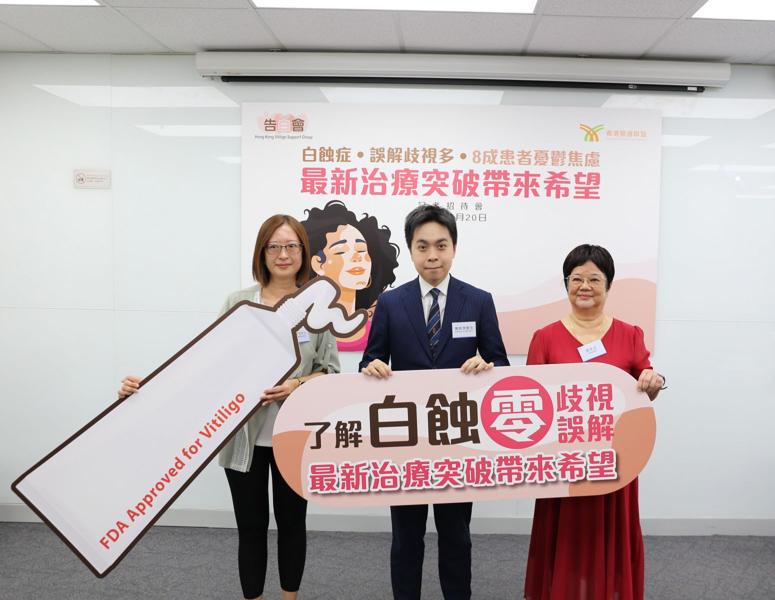 圖:(左起)香港醫護聯盟註冊社工黃敏兒女士、香港大學內科學系名譽4臨床助理教授 皮膚及性病科專科陳俊彥醫生、白蝕症患者吳女士/記者李安娜攝