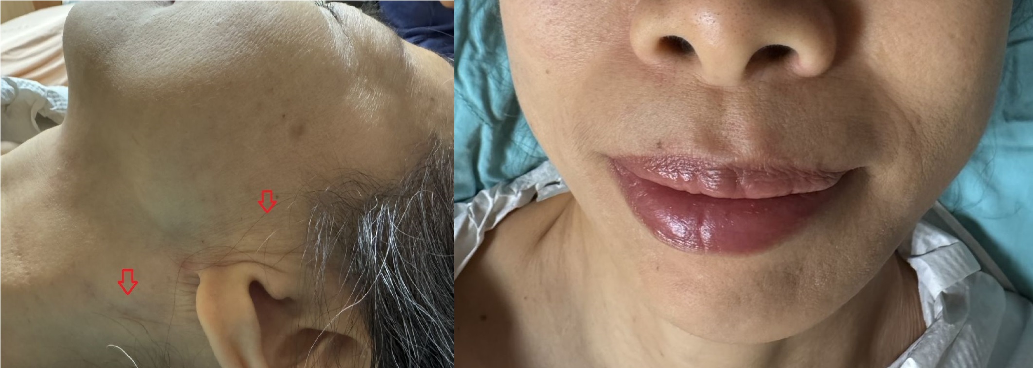 圖:透過腮腺切除手術及頸部旋轉皮瓣修補,不僅術後傷口幾乎不可見(左),病人外貌亦不受影響(右)/台北慈濟醫院提供